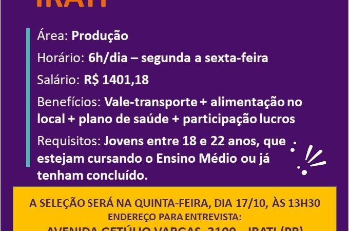 A pessoa contratada atuará seis horas por dia de segunda a sexta-feira, além de realizar a capacitação teórica na unidade do Centro de Integração Empresa-Escola do Paraná (CIEE). O salário será de R$ 1.401,18 mais os benefícios de vale-transporte, alimentação na empresa, plano de saúde e participação nos lucros.
